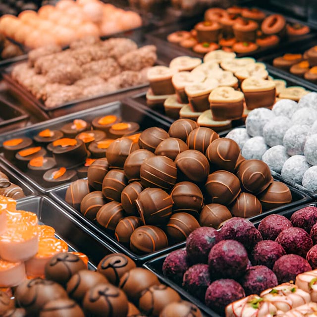 Premium chocolates include truffle assortments, milk, white, and dark chocolates, as well as gift boxes for special occasions.